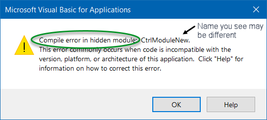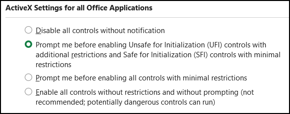 What is upsetting about this error is that it can occur after you have been using an add-in for years. And the message above from Microsoft implies that the add-in is incompatible with Excel. This is not true! The error you are receiving is because of a Microsoft Office update changed an Excel setting. Specifically, Microsoft changed the trust center setting on ActiveX controls to disable all controls. And did not tell or ask you about the change. Why is this important? Controls are what are used in add-ins and macros to get input from a user, like a range of cells to be searched or used. When Microsoft disabled all controls, the result is an error in an add-ins' module. This caused the above message to appear and the add-in will not work. Microsoft appears to be doing this change on a random stealth basis, changing the setting on only a small number of users with each update. Unfortunately, they forgot that a key Microsoft ActiveX control is the one that allows users to select a range of cells on a dialog. When this control is disabled by this ActiveX change, it creates the error in hidden module message when one tries to run our add-ins. Hopefully they will one day fix it. The solution is simple: In Excel do the following